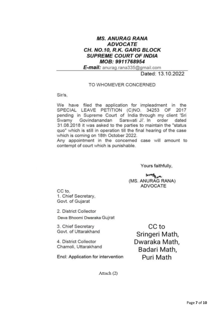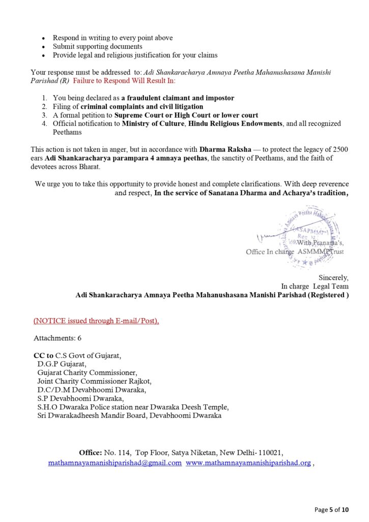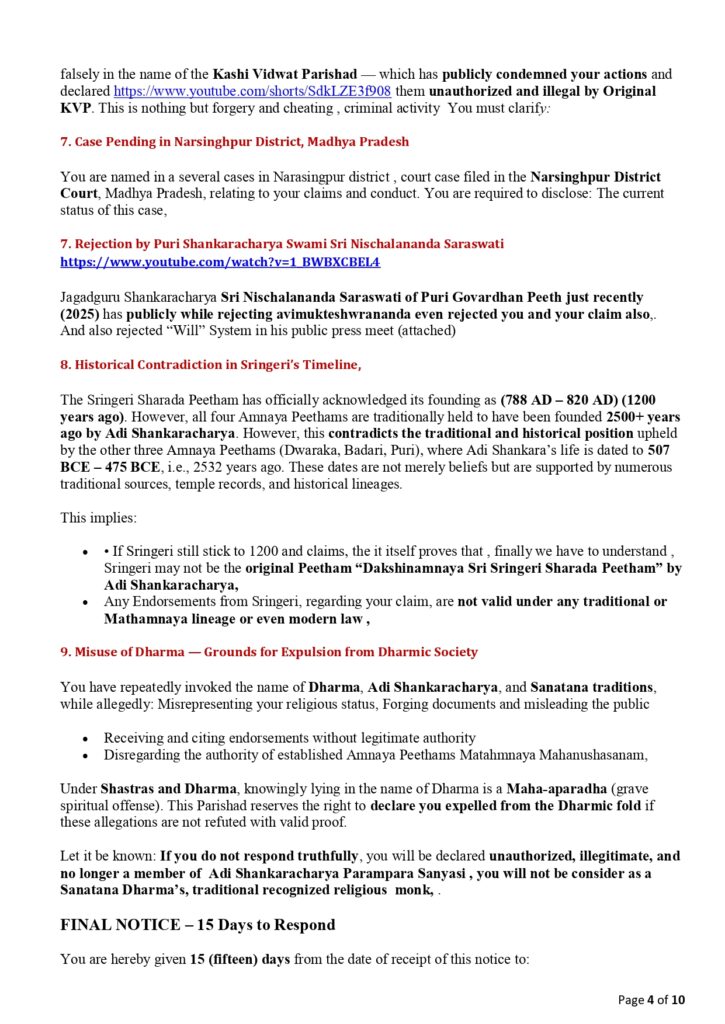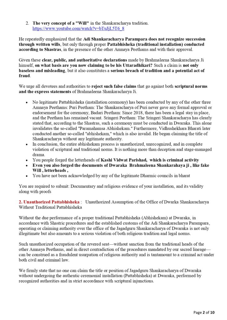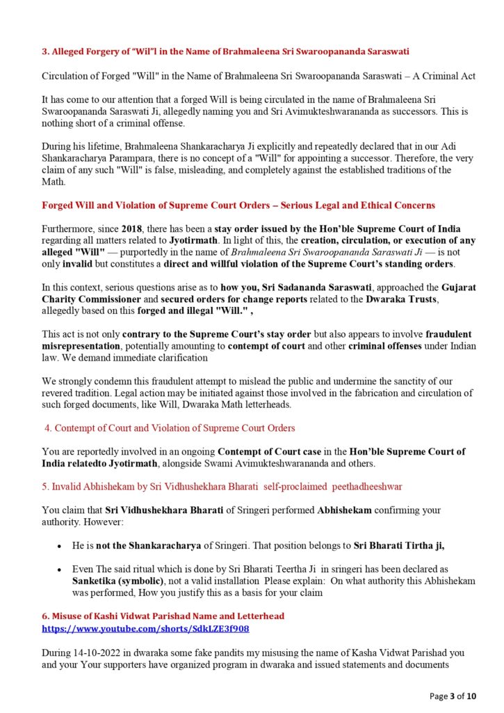 Notice to Sadananda Saraswati Demand for Clarification on False Religious Claims, Forgery, Fake “Will”, Misuse of Titles related to Dwaraka Math Shankaracharya, and Misrepresentation,